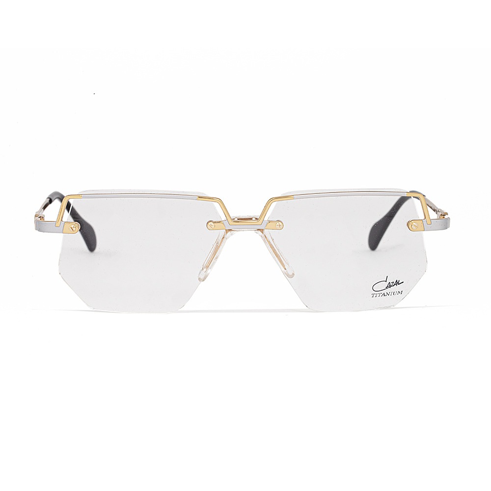Cazal 742 è un occhiale da vista con montatura in titanio a giorno e forma rettangolare irregolare. Il design fine anni ’80 è evidenziato dalla forma delle lenti, dall’abbianmento dei colori dove oro e argento dominano e dalla struttura assolutamente non minimale. Lo stile Cazal inconfondibile.