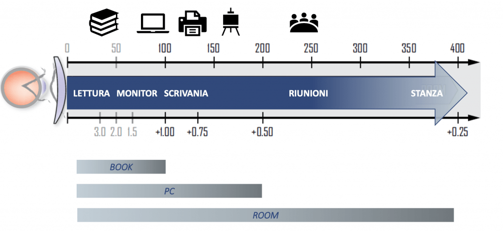 La tipologia ROOM, infine, ha campi visivi ancora più profondi, rispetto alle 2 tipologie elencate sopra, e permette una visione nitida con una profondità ancora maggiore (dai 40 cm fino a 3/4 metri). Questa lente per occhiali da ufficio è studiata per chi lavora alternando l’attività al pc (distanza intermedia), l’interazione con il cliente (distanza da lontano), e assicura al contempo anche una visione confortevole per la lettura. E’ l’ideale per chi deve spostarsi frequentemente dalla scrivania e si muove all’interno di spazi circoscritti come un ufficio o un ambulatorio.