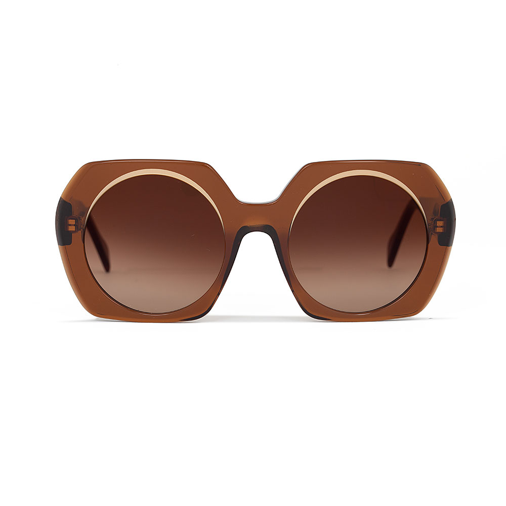 Andy Wolf’s Primrose sunglasses have a square shape with a round lens. The balance between the colors of the glasses and the shapes create a very refined and absolutely original ensemble. The glasses are made entirely in Austria from Italian acetate.