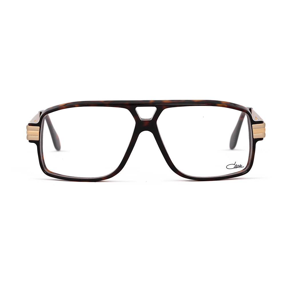 The Cazal 6023 prescription eyeglass has a large rectangular shape with a double bridge. The eyewear has a bold design when viewed from the side due to the sheet used with 8mm thickness. Frontally, on the other hand, it looks clean and light. A very interesting combination. Made in Germany.