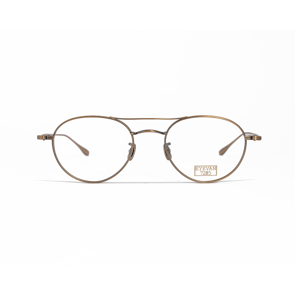 Eyevan 7285 – 191 prescription eyeglasses have a double bridge structure with lens shape intermediate between pantoscopic and pilot shape. In this model, an ultrathin 0.7-mm-thick top bar and single-block rods without a terminal are combined. The structure is made entirely of titanium.