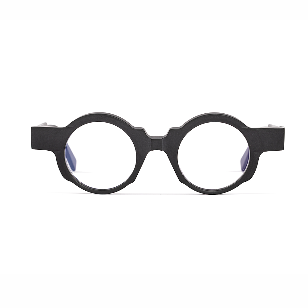 Kuboraum Mask K32 eyeglasses have a small round shape. The eyeglass has a bold design in the Kuboraum style of its origins. Also of note is the technical aspect in that having a small rim shape allows the lens thickness to be optimized for high visual defects.