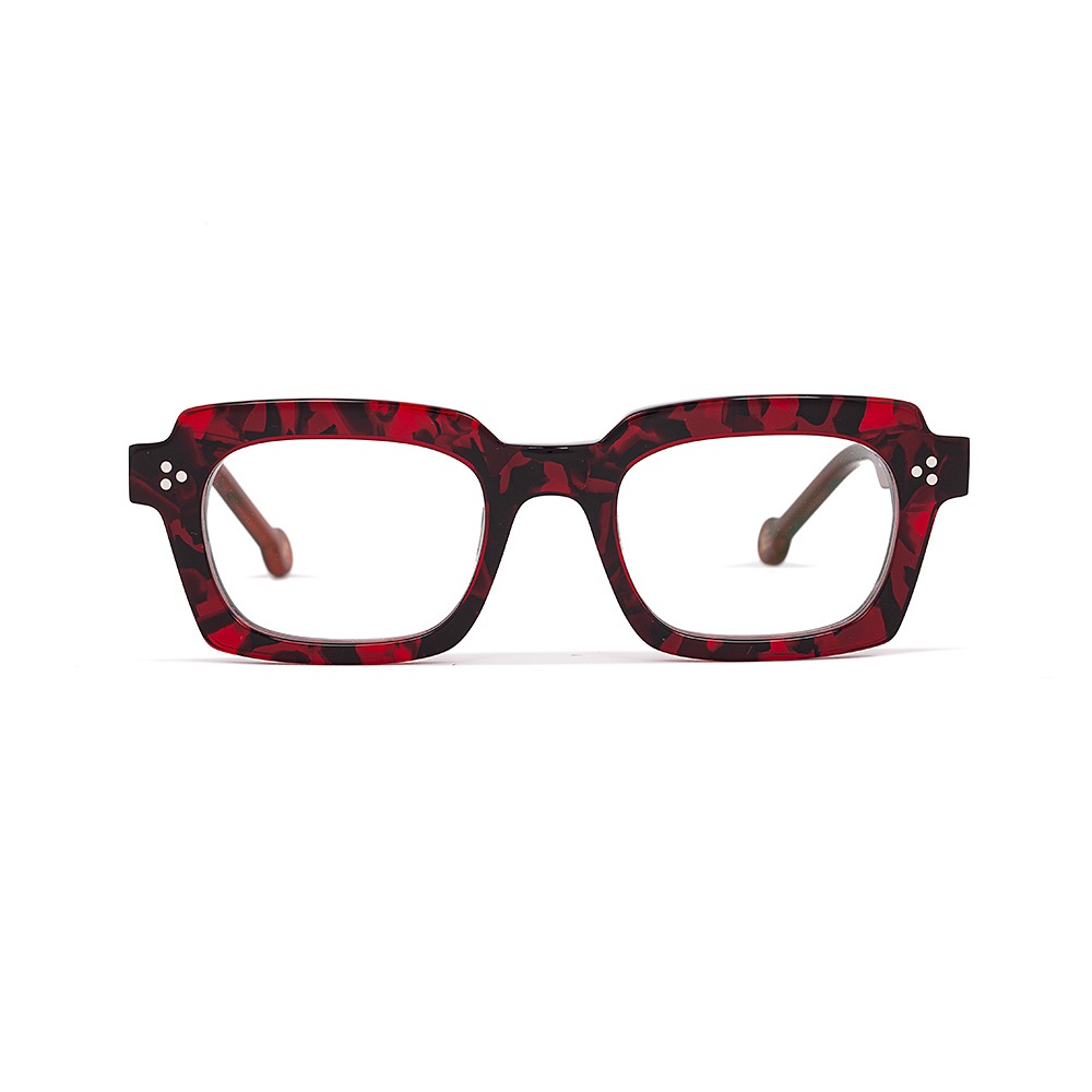The l.a. Eyeworks Fotini eyeglass has a medium-sized rectangular shape. The eyewear made of a luxurious, generously thick cellulose acetate with riveted hinges features a revisited retro design with a strong character. Perfectly made in Japan.