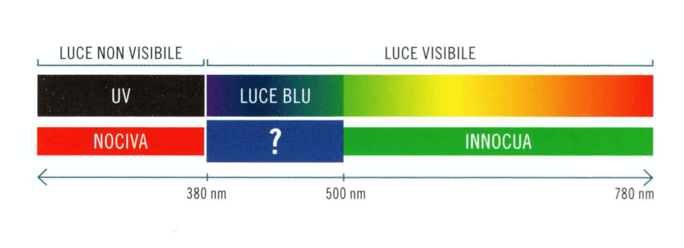 Solo alcune porzioni dello spettro della luce blu possono essere potenzialmente nocive. Vale la regola: più corta è la sua lunghezza d’onda, maggiore è la sua energia e quindi potenzialmente la luce blu è più pericolosa.
