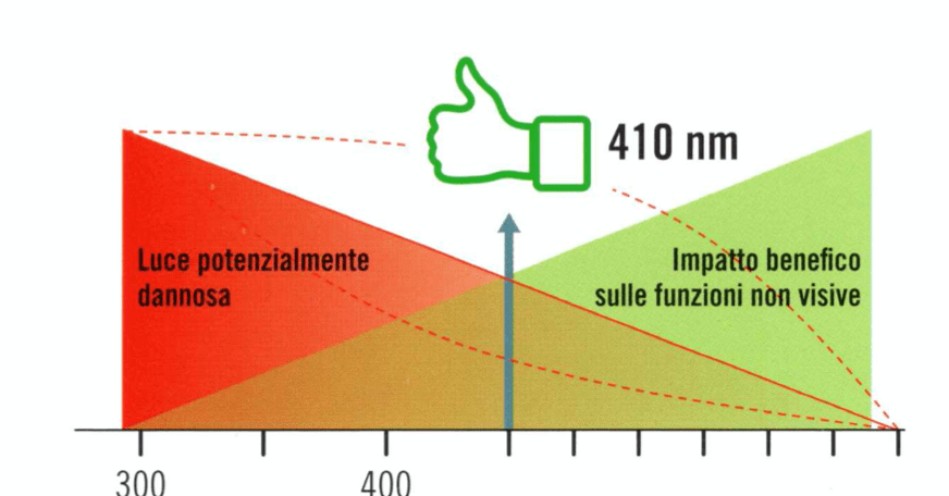 Sopra i 410 nm, la luce blu naturale assicura una corretta visione, un’ottima percezione dei colori e aiuta a mantenere un regolare ritmo circadiano.